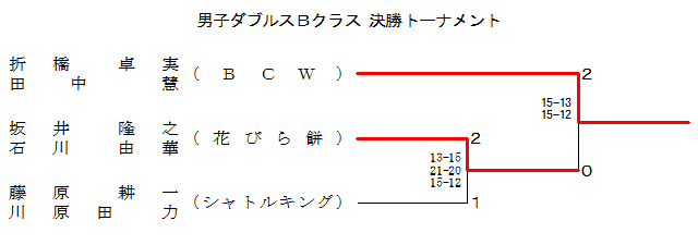 | 男子ダブルスBクラス Bブロック | 高崎 寺嶋 | 坂井 石川 | 藤原 西田 | 順位 |