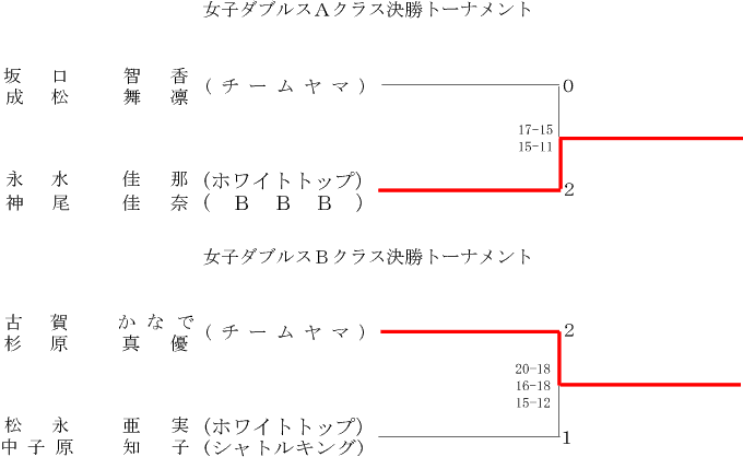| 松永 亜実 (ホワイトトップ) 中小原 知子 (シャトルキング) | ○ 15-11 15- 9 | × 15-17 15- 7 12-15 | ○ 15- 7 15- 7 | 2 | |